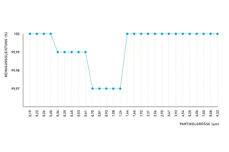PM10: 100% | PM2.5: 99,97% | MPPS 0,3: 99,99%