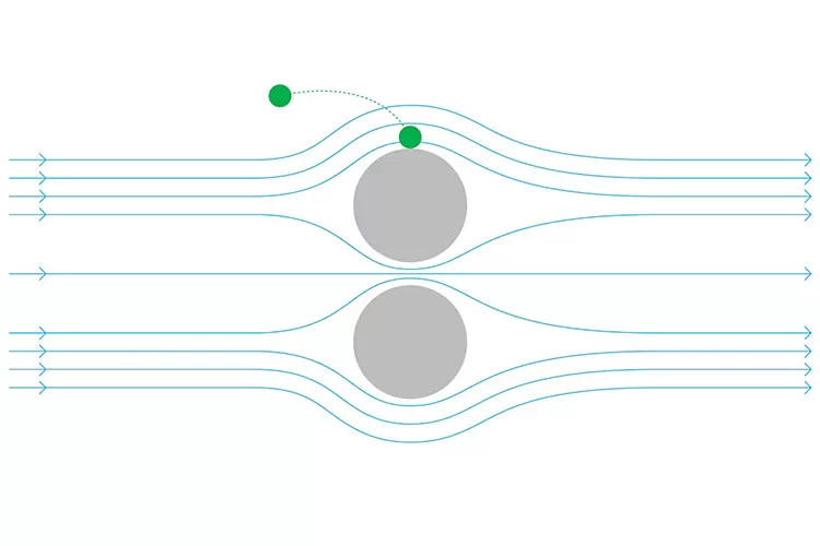 Những hạt nhỏ với khối lượng thấp dễ dàng di chuyển theo dòng không khí. Tuy nhiên, khi chúng đi sát các sợi lọc, lực hút giữa hạt và sợi sẽ khiến chúng bám vào bề mặt và bị giữ lại, giúp bộ lọc loại bỏ hiệu quả các hạt siêu nhỏ.